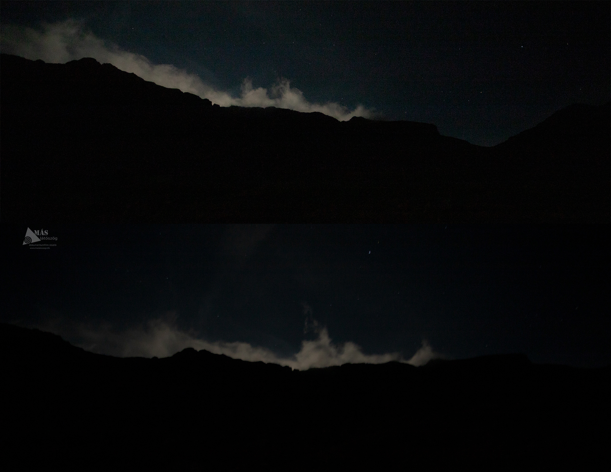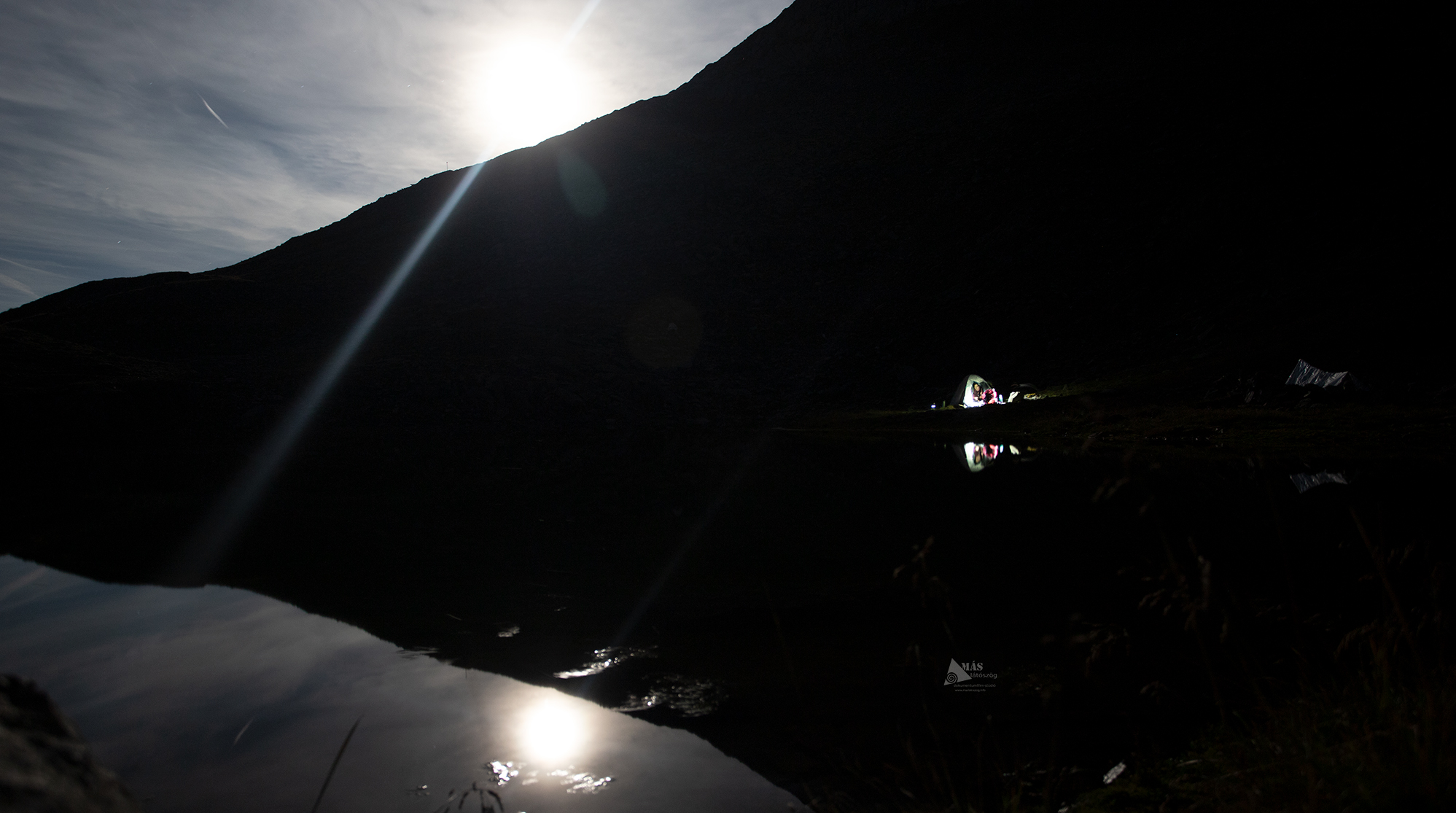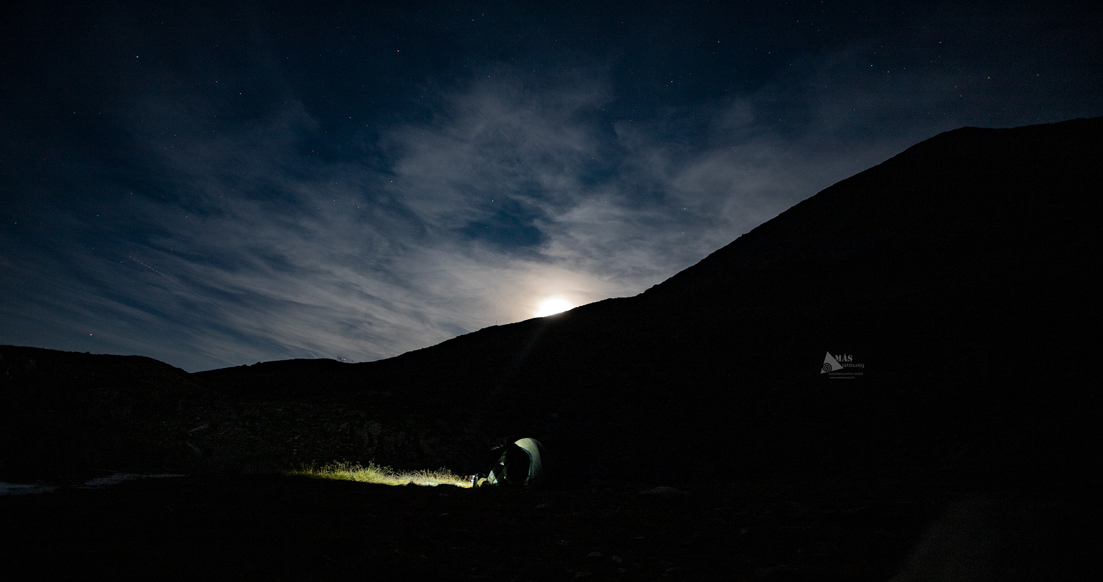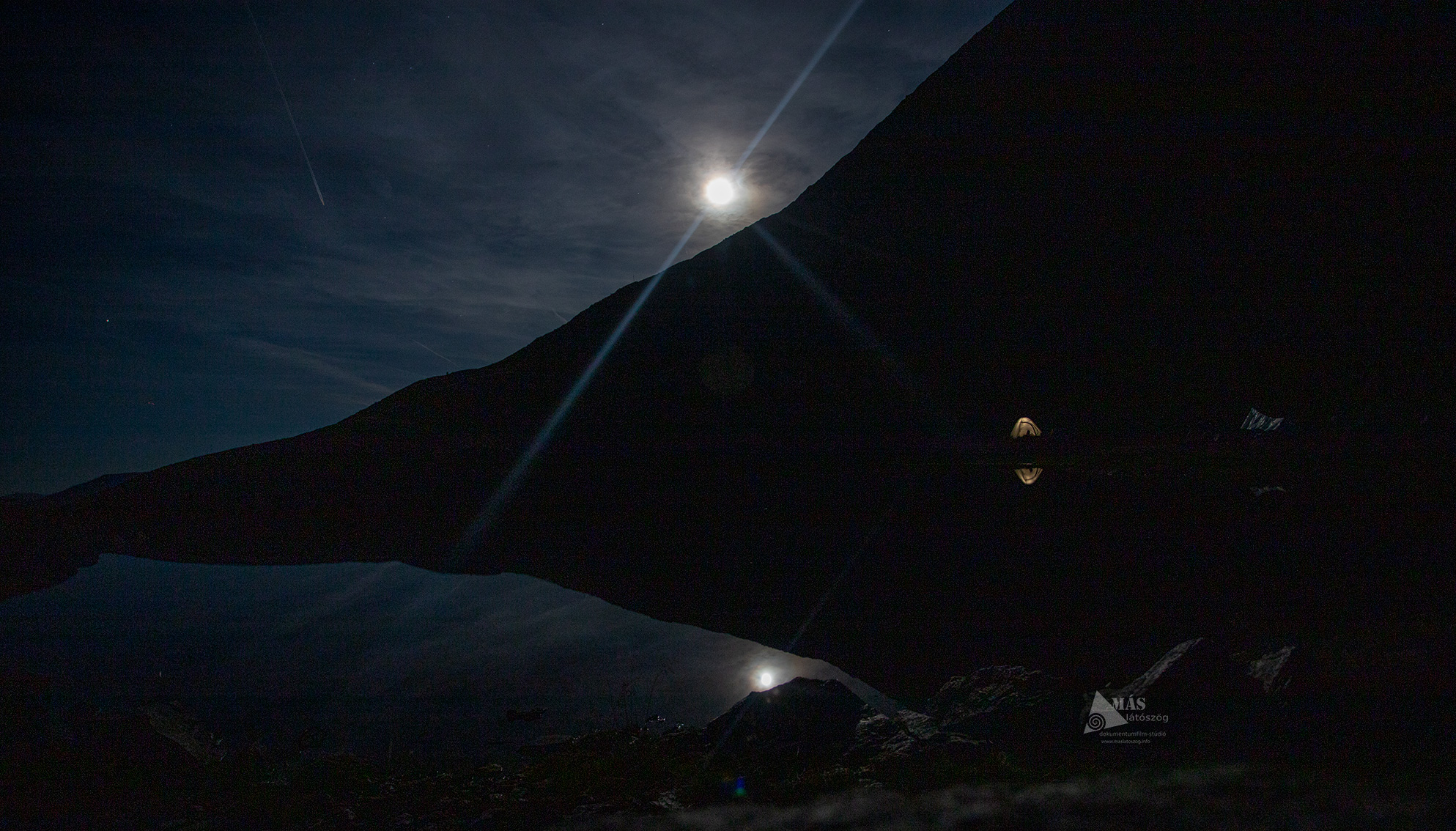Úgy 10 óra magasságában látom, hogy közeledik valami elemlámpa. Odaérnek és elkezdtek kiabálni a tó másik oldaláról, hogy van-e még sátorhely? Mivel csak mi voltunk, hát még akadt… Átjöttek. Egy fiatal máramarosi pár, azt láttam, hogy kurva nagy csomagjuk van, még fejszét is hoztak magukkal, na meg horgászbot is volt a legénynél, szóval nem csodálom, hogy nehéz útjuk volt eddig. Aztán úgy éjfél táján megint jött egy pár, azok a tó másik oldalán táboroztak le. Nagyon el lehet számolni az időt a hegyen, pláné egy hatalmas hegyen, mint a Fogarasi havas, ahol hatalmas szintkülönbségeket kell megmászni le és fel. Az 5 km az úgy 10 + nak felel meg normális úthoz viszonyítva, ezzel jó ha számol mindenki. Az éjszaka szép teli holddal telt el, kevés alvással. Az egyszemélyes kínai sátram nem volt valami nyerő kettőnknek. Jól teleszuszogtuk, bevizesedet a fala, így vigyázni kellett, hogy ne érj hozzá, mert megvizül a hálózsák is, hát igen...