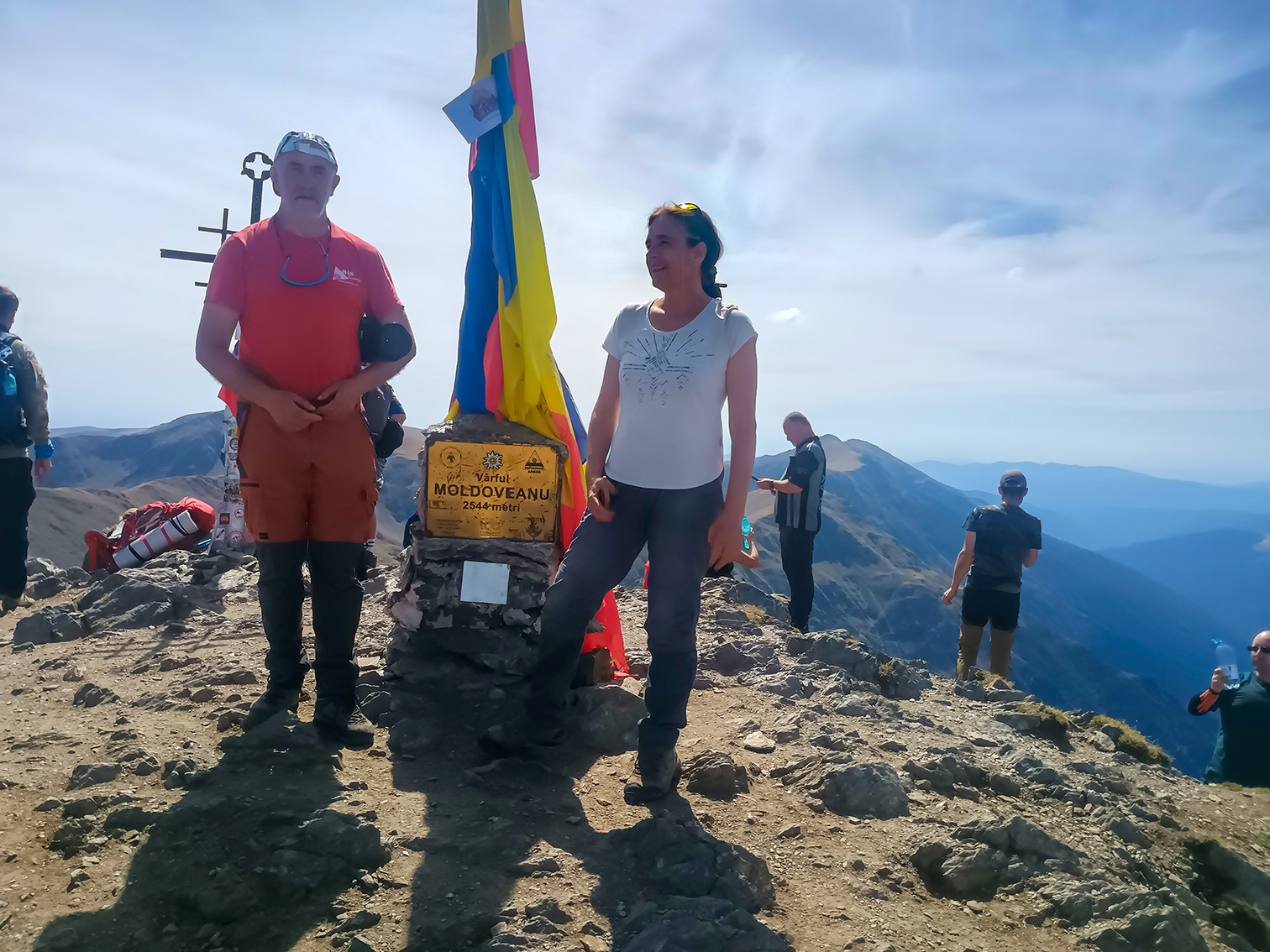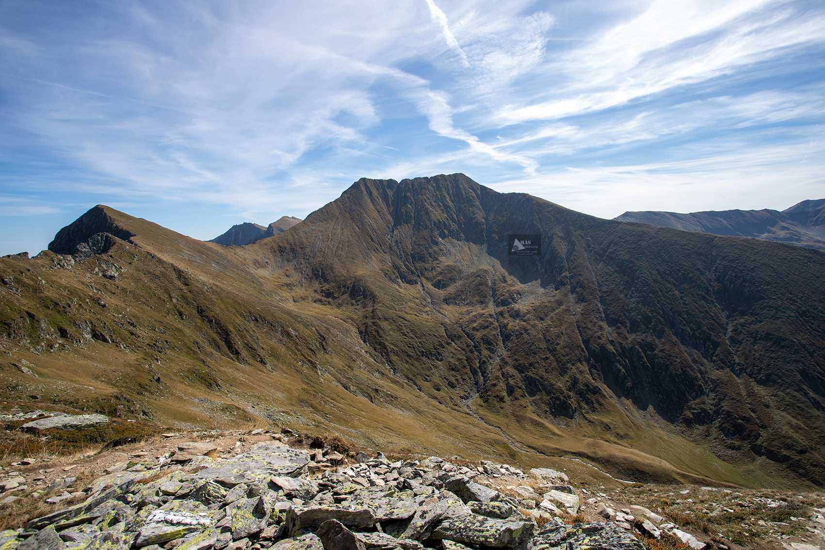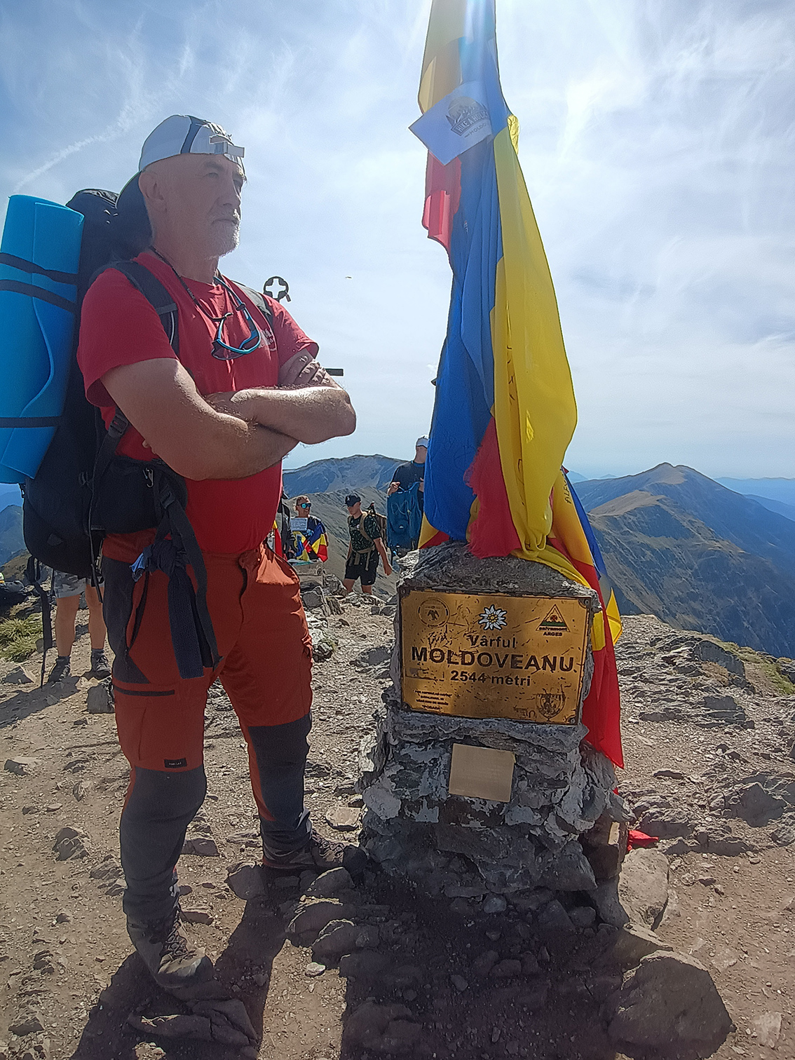A Moldoveanu csúcsra úgy lehet feljutni ebből az irányból, hogy az ember felmegy egyszer a Nagy-Vist csúcsra, ami Románia 3. legmagasabb pontja, 2527 m és úgy 200 méter szintet kell meglépni egyből a nyeregből. Ezt 12,45-kor sikeredett elérni, ami megint az igazolta, hogy jó ötlet volt megállni, hisz innen a Moldoveanu úgy kb. fél óra a gerincen egy kicsi sziklás le- és felmászkálással, de vannak láncok. Ami viszont meglepett az az, hogy mire odaértünk, kezedet benépesedni, a bőcsködős képekért sorba kellett állni.