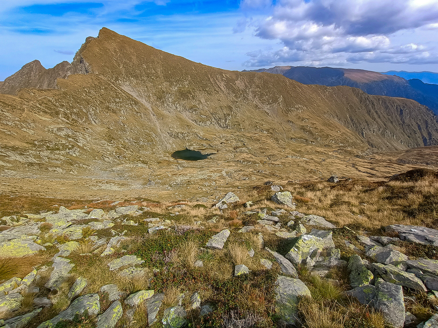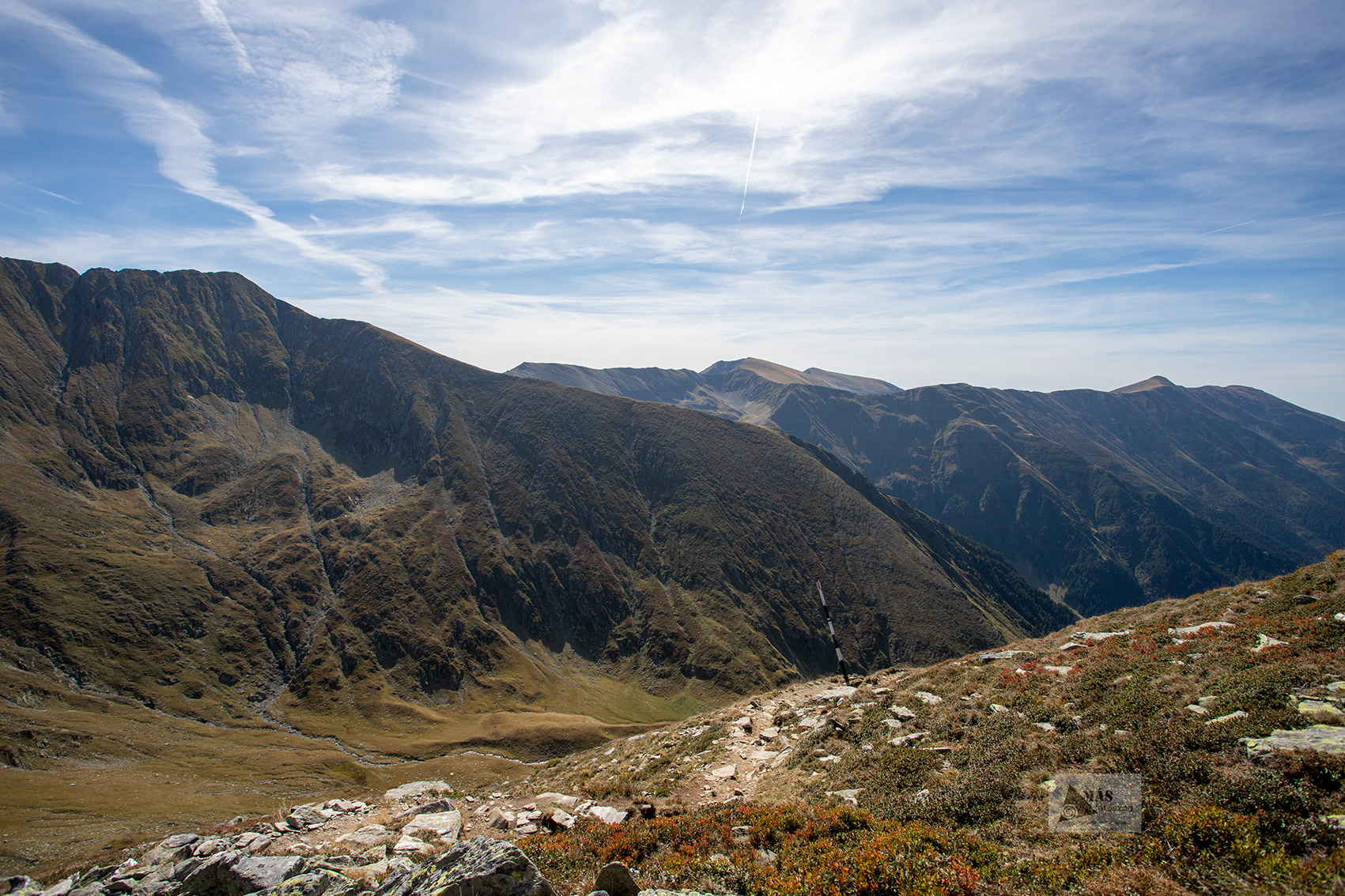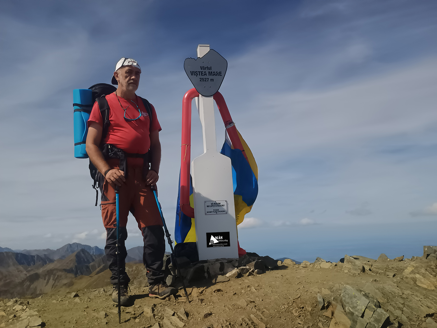 A Moldoveanu csúcsra úgy lehet feljutni ebből az irányból, hogy az ember felmegy egyszer a Nagy-Vist csúcsra, ami Románia 3. legmagasabb pontja, 2527 m és úgy 200 méter szintet kell meglépni egyből a nyeregből. Ezt 12,45-kor sikeredett elérni, ami megint az igazolta, hogy jó ötlet volt megállni, hisz innen a Moldoveanu úgy kb. fél óra a gerincen egy kicsi sziklás le- és felmászkálással, de vannak láncok. Ami viszont meglepett az az, hogy mire odaértünk, kezedet benépesedni, a bőcsködős képekért sorba kellett állni.