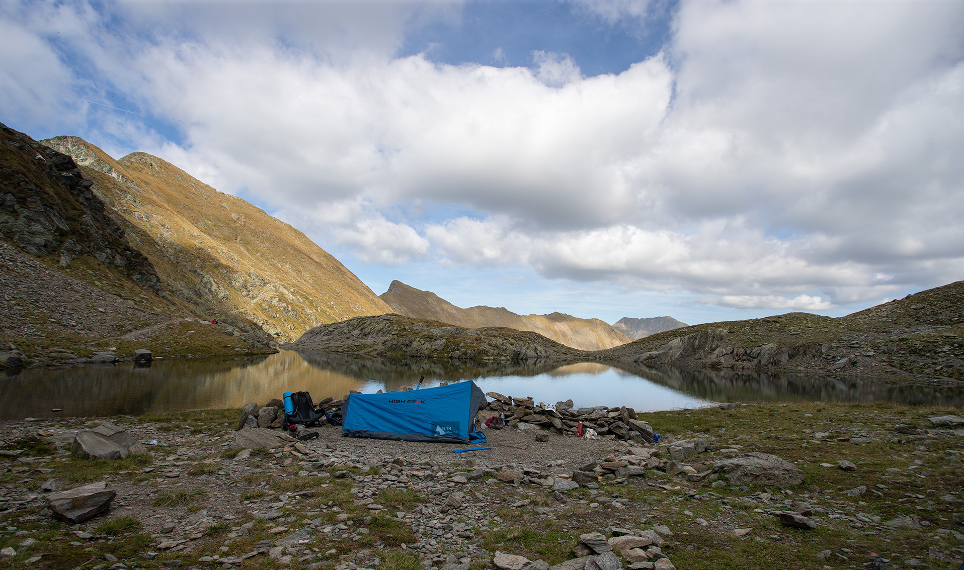 Mivel az ottani menedék kunyhót 2012-ben egy lavina szétzúzta, így maradt a sátor. Kerestünk egy megfelelő sátorhelyet. Viszont nagyon szemetes volt a környék, ennyi szétdobált palackot, meg a kunyhó purhab szigetelésének maradványait, ejsze, nem is láttam még más helyen a hegyekben. Mivelhogy volt időm a sátor felhúzás után, nekiálltam összeszedni, a palackokat meg a purhabot. A palackokat sikerült is mind összetakarítani, de a purhabot azt nem abból iszonyú sok volt, remélem még valaki másnak is lesz erre ideje.