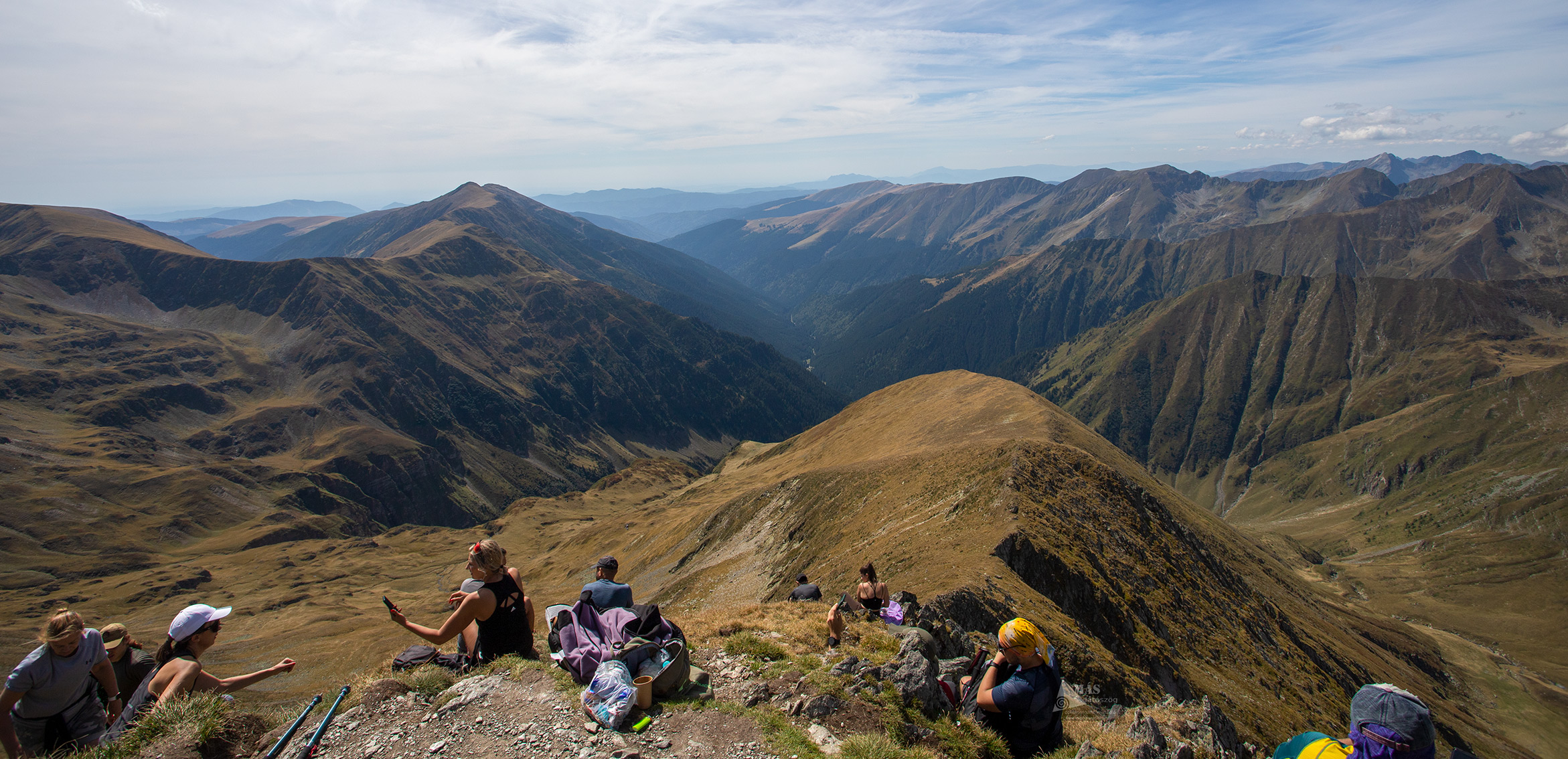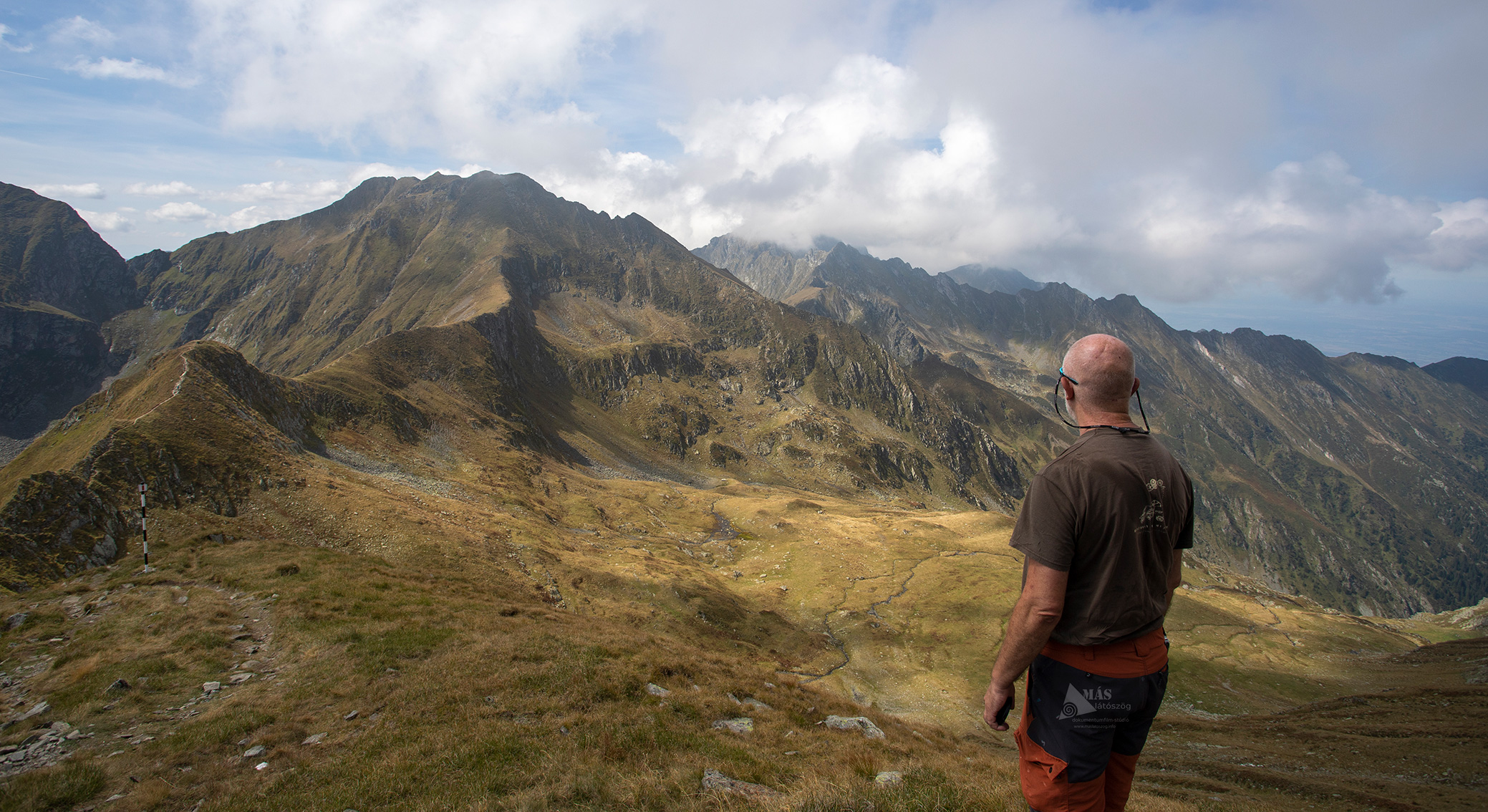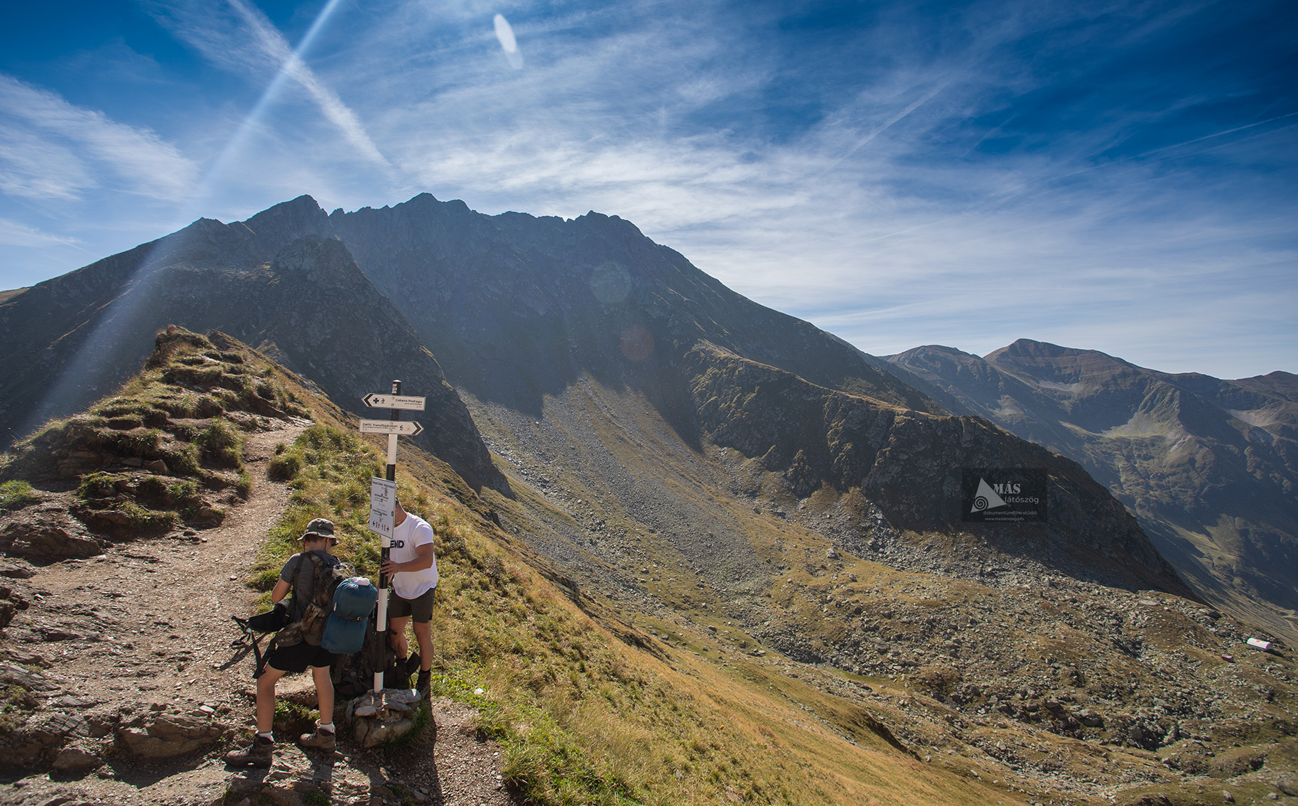 A szomszédok előttünk elhúztak. Néztem is, hogy ekkora csomaggal nehéz lesz az nekik. Kávé és egy laza reggeli után mi is belehúztunk. A Podrágu nyeregben utolértük a szomszédokat, azon tanakodtak, hogy lemenjenek a menedékházhoz és letegyék a csomagokat, vagy tegyék csak úgy le valahol a gerincen és majd érte jönnek. Így hát hagytuk dilemmázni őket és elmentünk. Egy kis idő után találkoztunk a legényekkel, akiktől elváltunk a tegnap, es azt mondták, hogy jó döntés volt, hogy leállunk, mert ők is csak késő este érték el a Vist menedéket, és a Moldoveanut csak ma hajnalba tudták megmászni. Erre a nagy ijedtségre leültünk egyet enni. Alighogy nekifogtunk, hát jönnek a volt szomszédjaink, zsák nélkül. Letették, de elfogyott a vizük, az viszont szívás, mert nekünk is csak épp egy kicsi volt, és még egy egész napos út előttünk. Ettünk és indulatba jöttünk mi is. A csúcs előtt megint találkoztunk velük, feladták, jöttek visszafelé.